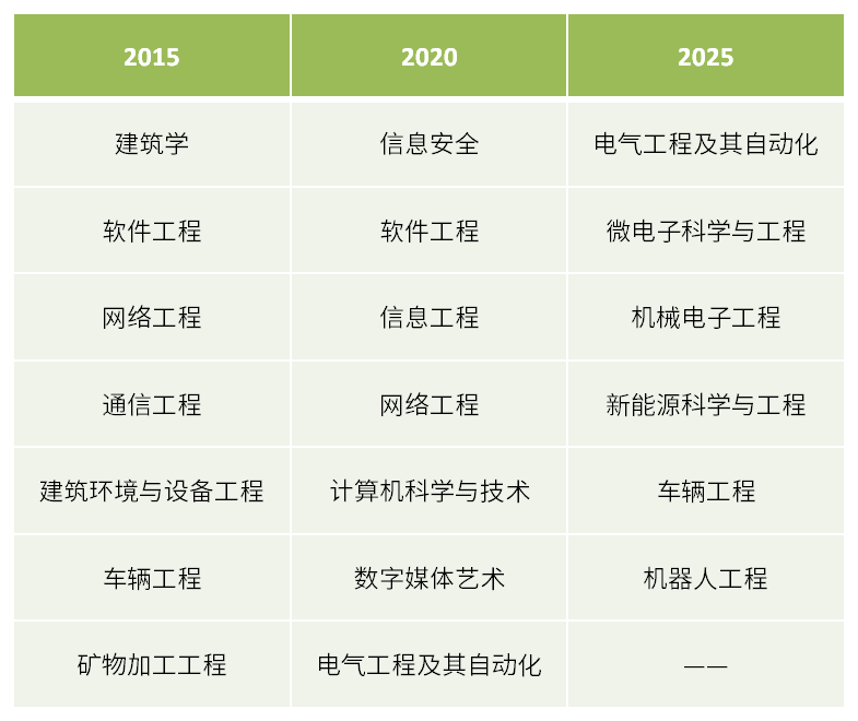 按照麦可思研究院的数据来看,近十年间的绿牌专业(绿牌指的是就业对劲度高的需求增加型专业)根基均为工科专业,但具体的专业标的目的有些微妙的变化。好比,正在2015年、2020年均上榜的软件工程、收集工程消逝正在本年的榜单上;电气工程及其从动化正在2015年未上榜,但正在近五年却连结着不错的位次。