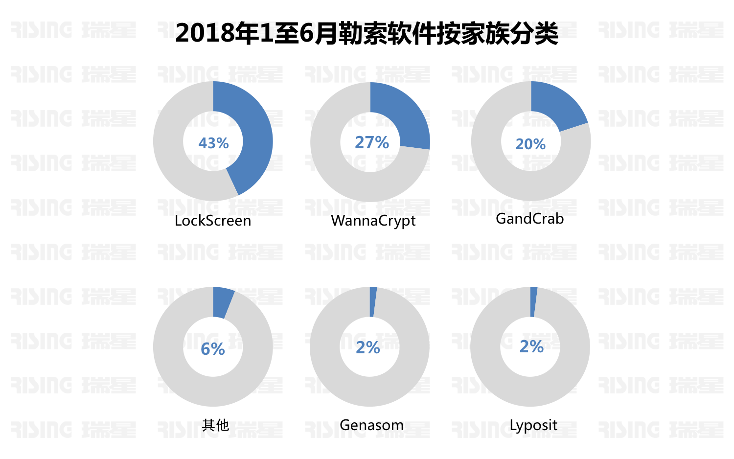 通过对瑞星捕捉的样本按家族阐发发觉,LockScreen家族占比43%,位列第一,其次为WannaCrypt占比27%,以及GandCrab占比20%。