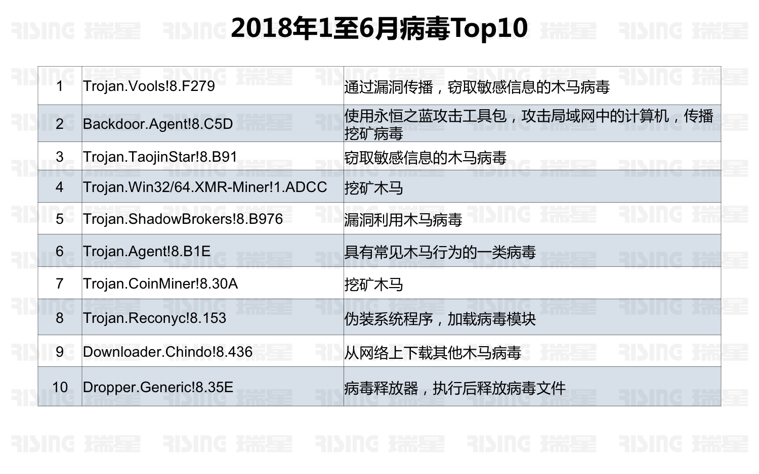 按照病毒传染人数、变种数量和代表性进行分析评估,瑞星评选出了2018年上半年1至6月病毒Top10: