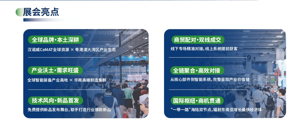 做为汉诺威旗下CeMAT品牌展会,LET秉承了汉诺威“科技、立异、办事”的焦点,正在当前“新质出产力”驱动和“工业配备以旧换新”等利好政策的支撑下,展会将为展商带来全财产链的高质量买家资本,帮力企业抢占粤港澳大湾区、华南、东盟、一带一等火热市场商机。