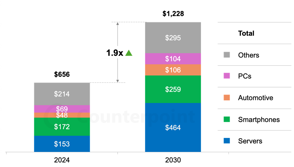 按照Counterpoint的新研究,全球半导体收入估计将从2024年到2030年翻一番,达到跨越1万亿美元,这一增加由AI转型驱动,旨正在为从生成式AI(GenAI)到代办署理型AI(Agentic AI)再到物理AI(Physical AI)的使用建立根本设备和消费终端。