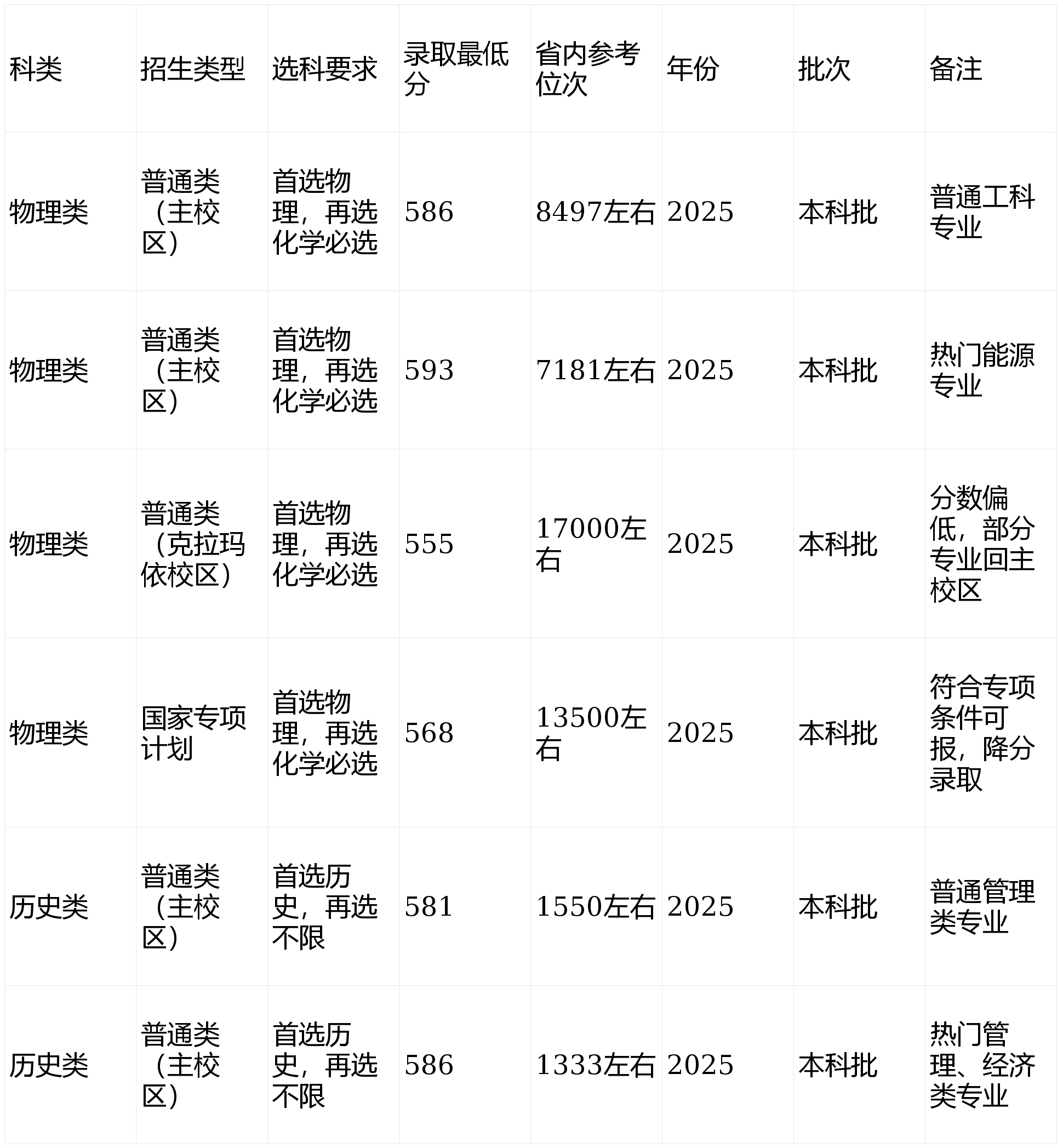 :物理类的石油工程、油气储运工程、资本勘查工程、计较机科学取手艺,汗青类的能源经济、会计学、,2025年物理类通俗类最低586分、部门抢手专业593分,汗青类通俗类最低581分、抢手专业586分即可报考,适配中高分段考生;克拉玛依校区分数相对较低,可做为平分段考生的高性价比选择。